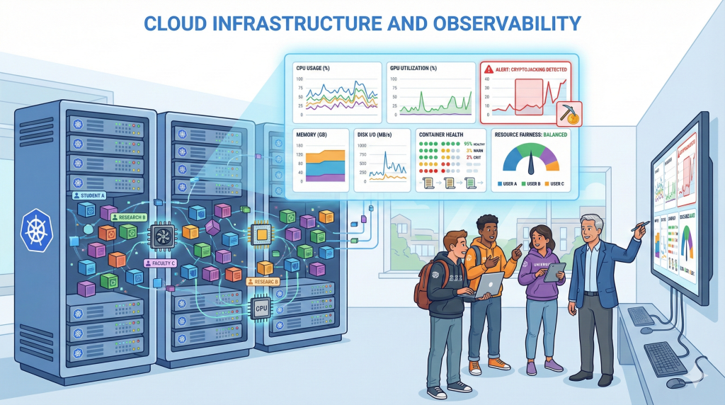 On top of this infrastructure we develop observability and security pipelines. Cluster‑wide monitoring collects metrics, logs, and traces with low overhead, enabling fairness‑oriented telemetry across shared resource pools and early detection of anomalies such as CryptoJacking containers or abusive jobs. The overall theme is to create observable, secure, and student‑friendly cloud platforms that double as both research testbeds and teaching environments.