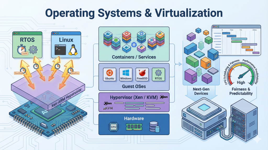 We design and analyze operating systems and hypervisors so that modern devices – from embedded ARM boards to cloud servers – can run multiple OSes and applications with real‑time guarantees. Our work on Xen‑ARM introduces real‑time–aware scheduling, timer hypercalls, and interrupt‑latency optimizations that let mobile and embedded systems meet strict deadlines even when they are fully virtualized. We also study I/O paths in virtualized environments to understand where latency comes from, and how to reshape the scheduler and interrupt handling to make response times predictable.