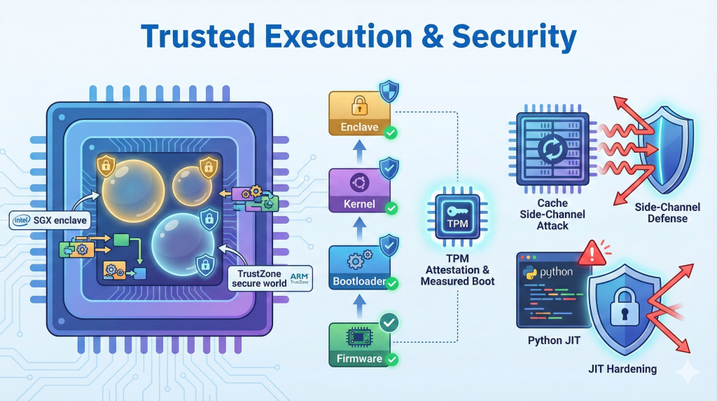 On top of these TEEs, we analyze and mitigate realistic attack surfaces: cache‑based side channels that recover Android pattern locks, weaknesses in kernel and Nested Kernel memory protection, and exploitation paths in copy‑and‑patch Python JIT engines. We also design secure ML runtimes (e.g., SGX‑based secure TensorFlow) that keep training and inference data confidential. The common theme is to make trusted execution practical and robust—by combining hardware enclaves, secure boot, and runtime hardening into one coherent security stack.